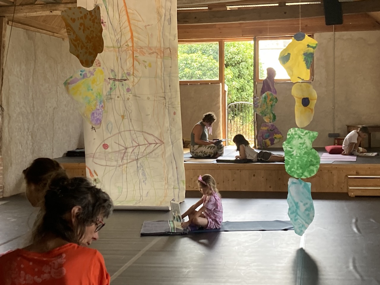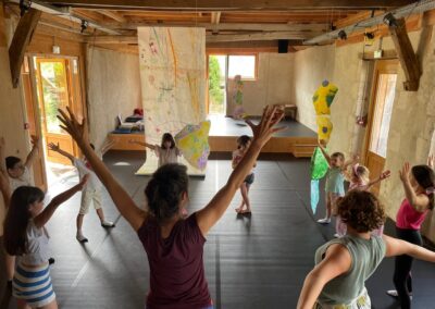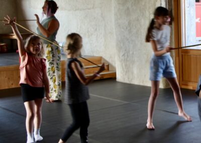 Gaëlle, Nadia, et les enfants ont cheminé vers des approches plurielles et complémentaires à travers la pratique du yoga, de la danse, du chant, et de la musique tout au long de la semaine.